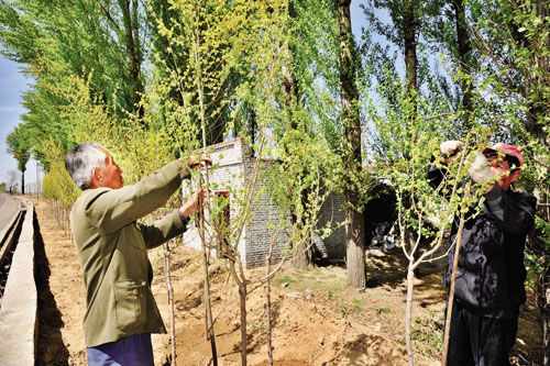 代縣縣委、縣政府堅(jiān)持“生態(tài)綠色發(fā)展,共建美好家園”的執(zhí)政理念,今春鋪開了總投資1120 萬(wàn)元的108 國(guó)道東段通道綠化工程、投資2000 多萬(wàn)元的鞏固退耕還林項(xiàng)目干果經(jīng)濟(jì)林工程和京津風(fēng)沙源治理工程以及全民義務(wù)植樹工程,切實(shí)做到規(guī)劃高起點(diǎn)、施工高質(zhì)量、建設(shè)高標(biāo)準(zhǔn)、開發(fā)高效益。代縣作為京津地區(qū)的風(fēng)沙源頭,通過(guò)歷年堅(jiān)持不懈的生態(tài)綠化,全縣已擁有林地面積171 萬(wàn)畝,占到總國(guó)土面積的66.3%,基本實(shí)現(xiàn)了“春季花滿坡、夏季綠蔭濃、秋季五彩畫、冬季松柏青”的美好愿景,為京津地區(qū)筑起了防風(fēng)固沙綠色屏障。圖為工人們?cè)谛藜魳渲?。(石俊?攝)