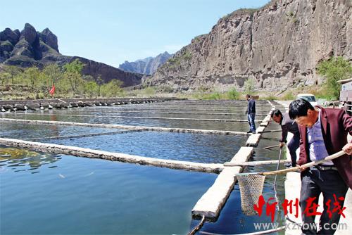 素有“江南水鄉(xiāng)”美稱(chēng)的五臺(tái)縣陳家莊鄉(xiāng),是一個(gè)海拔只有640 米的秀美山鄉(xiāng),在五臺(tái)農(nóng)村商業(yè)銀行“金融扶貧”、“水產(chǎn)信貸”等專(zhuān)項(xiàng)貸款的大力扶持下,鄉(xiāng)黨委、鄉(xiāng)政府圍繞得天獨(dú)厚的泉水資源, 號(hào)召農(nóng)民發(fā)展水產(chǎn)養(yǎng)殖業(yè)。村民們先后建成5 個(gè)露天養(yǎng)魚(yú)場(chǎng),投放名貴紅鱒魚(yú)苗150 萬(wàn)尾,今年產(chǎn)量可望達(dá)到1.3 萬(wàn)公斤,以每公斤68元的價(jià)格遠(yuǎn)銷(xiāo)北京、西安,近銷(xiāo)太原、忻州、五臺(tái)山,年收入可達(dá)88 萬(wàn)元。圖為村民們?cè)谏饺B(yǎng)魚(yú)池?fù)启~(yú)。(金俊賢 鄭光 攝影報(bào)道)