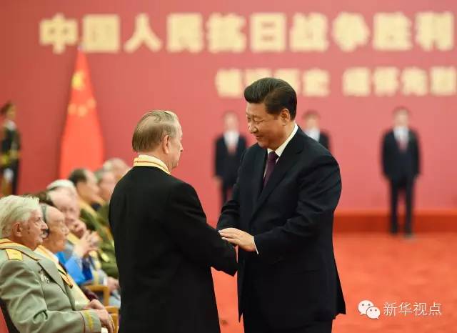2015年9月2日,習近平在北京人民大會堂向30名抗戰(zhàn)老戰(zhàn)士老同志、抗戰(zhàn)將領(lǐng)、幫助和支持中國抗戰(zhàn)的國際友人或其遺屬代表頒發(fā)中國人民抗日戰(zhàn)爭勝利70周年紀念章并發(fā)表重要講話。新華社記者 謝環(huán)馳攝