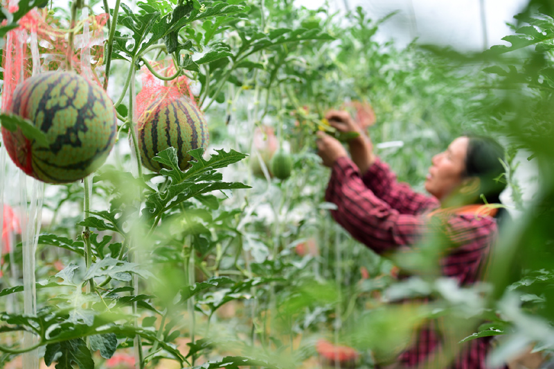 ▲5月7日,在河北省石家莊市靈壽縣三圣院鄉(xiāng)木佛莊園有機(jī)蔬菜種植基地,農(nóng)戶在管護(hù)大棚西瓜。