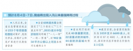 據(jù)氣象部門報(bào)告,預(yù)計(jì)8月4日-7日,我省將出現(xiàn)入汛以來最強(qiáng)降雨過程。為做好此次強(qiáng)降雨防范應(yīng)對(duì),8月3日下午,省防汛抗旱指揮部組織了緊急會(huì)商,進(jìn)一步強(qiáng)弱項(xiàng)、補(bǔ)短板,全力做好各項(xiàng)工作,確保安全度汛。