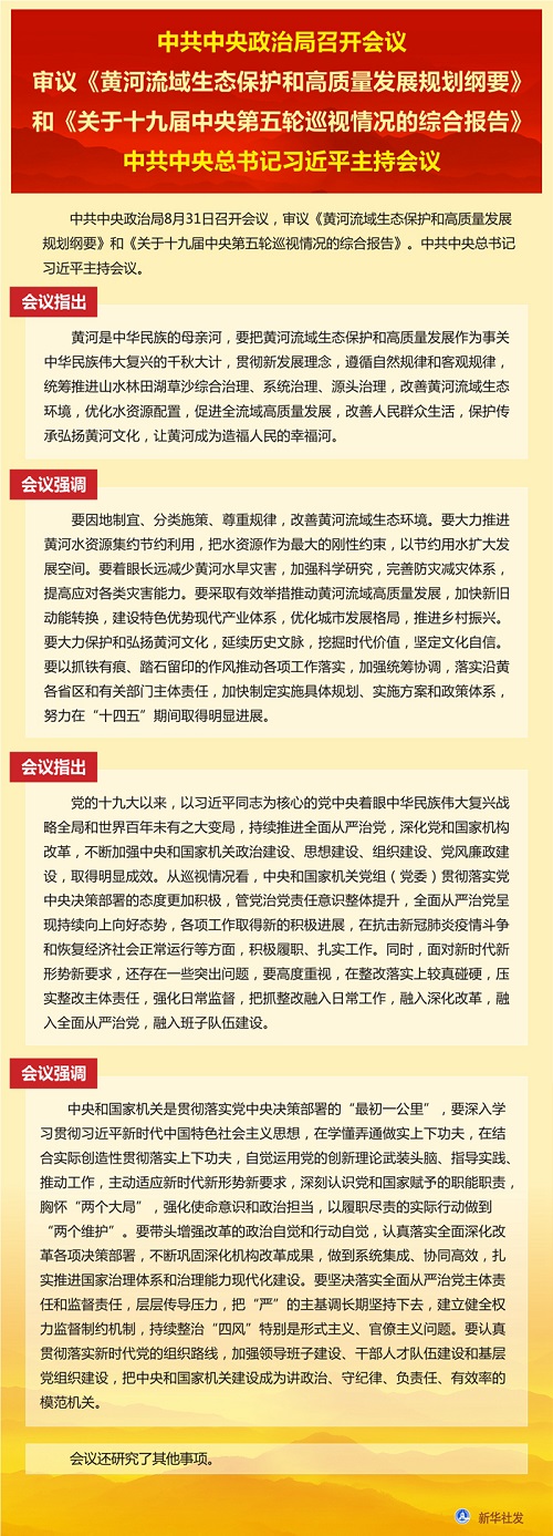 新華社北京8月31日電 中共中央政治局8月31日召開會(huì)議,審議《黃河流域生態(tài)保護(hù)和高質(zhì)量發(fā)展規(guī)劃綱要》和《關(guān)于十九屆中央第五輪巡視情況的綜合報(bào)告》。中共中央總書記習(xí)近平主持會(huì)議。