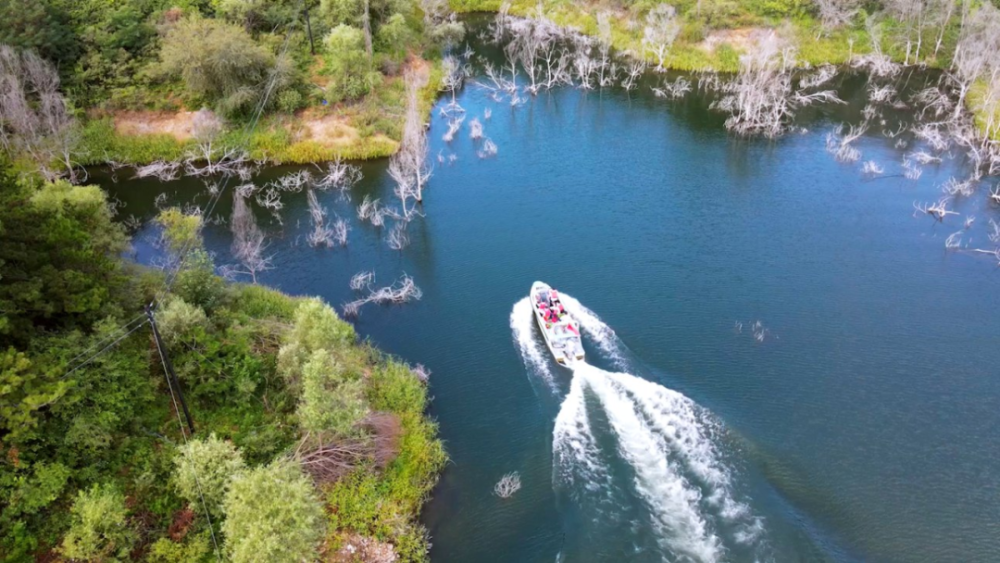 8月21日拍攝的北京市密云水庫(kù)綜合執(zhí)法大隊(duì)水上分隊(duì)隊(duì)員執(zhí)行任務(wù)(無(wú)人機(jī)拍攝)(記者夏子麟攝)