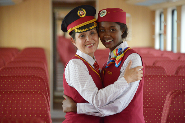 2016年10月1日,在埃塞俄比亞首都亞的斯亞貝巴拉布車站,中方列車長丁繼華(左)和埃塞俄比亞乘務(wù)員沃克內(nèi)什·貝特魯擁抱。新華社記者孫瑞博攝