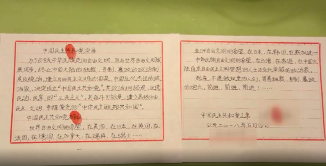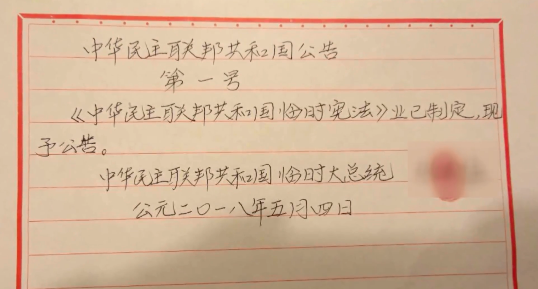 在境外落腳的酒店內(nèi),張某起草了他所謂的“建國(guó)綱領(lǐng)”和“建黨綱領(lǐng)”,隨后,在酒店房間內(nèi)舉行儀式,宣布成立“中國(guó)民主共和黨”和“中華民主聯(lián)邦共和國(guó)”,并宣誓出任“大總統(tǒng)”,頒布“總統(tǒng)一號(hào)令”。