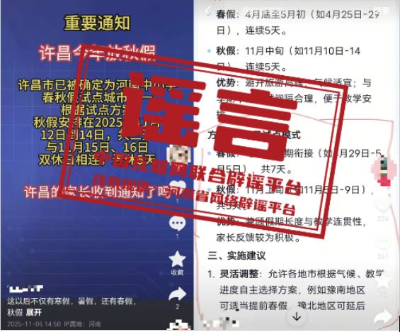 真相:近日,河南、安徽部分自媒體平臺(tái)發(fā)布關(guān)于中小學(xué)春秋放假的信息,聲稱“許昌市已被確定為河南中小學(xué)春秋假試點(diǎn)城市之一”“周口市中小學(xué)2025年秋假時(shí)間安排如下”“蕪湖市中小學(xué)將在11月12日至14日放首個(gè)秋假,連周末共5天”,引發(fā)關(guān)注。對(duì)此,河南許昌、周口及安徽蕪湖教育部門作出回應(yīng):并無(wú)放秋假的安排,網(wǎng)傳消息均為謠言。中小學(xué)放假安排需嚴(yán)格遵循國(guó)家教育方針政策及當(dāng)?shù)亟逃块T的統(tǒng)一部署,結(jié)合本地教育教學(xué)實(shí)際統(tǒng)籌規(guī)劃。如需了解相關(guān)安排,請(qǐng)通過(guò)屬地教育部門官方網(wǎng)站,切勿輕信、傳播未經(jīng)官方確認(rèn)的“小道消息”。(來(lái)源:“清朗河南”微信公眾號(hào)、@大河網(wǎng)、安徽網(wǎng)絡(luò)辟謠平臺(tái))