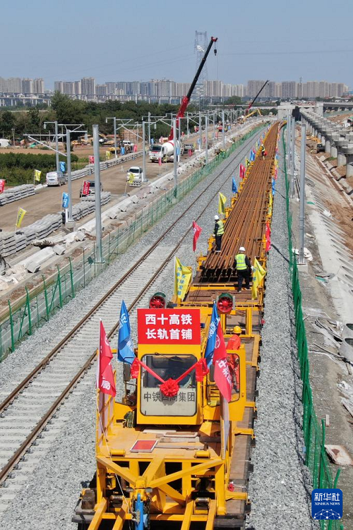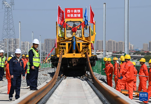 9月8日,在西十高鐵建設(shè)現(xiàn)場西安東至藍(lán)田作業(yè)區(qū)間,施工人員將首對500米長的無縫鋼軌平穩(wěn)鋪設(shè)在無砟軌道板上,標(biāo)志著由西成客專陜西公司建設(shè)、中鐵四局施工的西十高鐵全線鋪軌正式啟動。