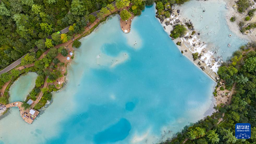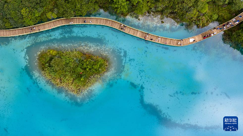 9月8日,游客在藍(lán)月谷游玩(無(wú)人機(jī)照片)。(新華社記者 胡超 攝)