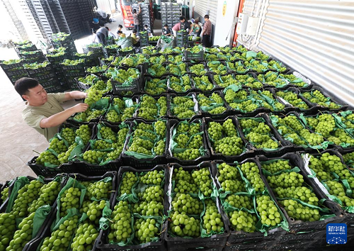 9月11日,在河北省晉州市桃園鎮(zhèn)周頭村一家葡萄種植基地,農民將采收的葡萄分揀裝箱。(新華社記者 楊世堯 攝)