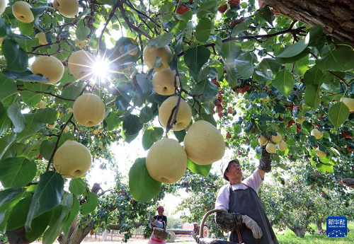 9月11日,河北省晉州市周家莊鄉(xiāng)第七生產隊農民在梨園采收鴨梨。(新華社記者 楊世堯 攝)
