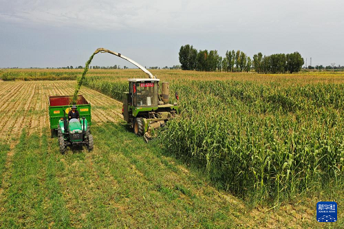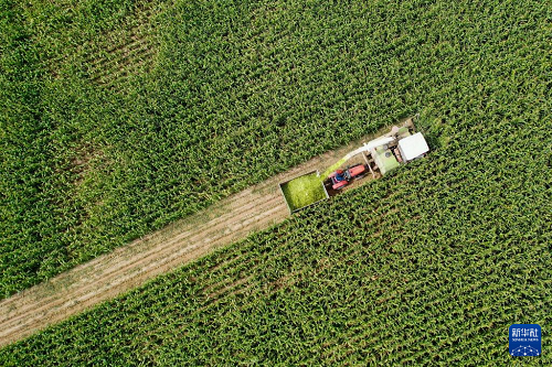 9月11日,農(nóng)機手操作農(nóng)機在杭錦旗吉日嘎朗圖鎮(zhèn)格更召嘎查田間收割青貯玉米(無人機照片)。(新華社記者 李志鵬 攝)