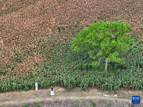 9月21日,游人在高粱地打卡拍照(無人機照片)。(新華社記者 季春鵬 攝)