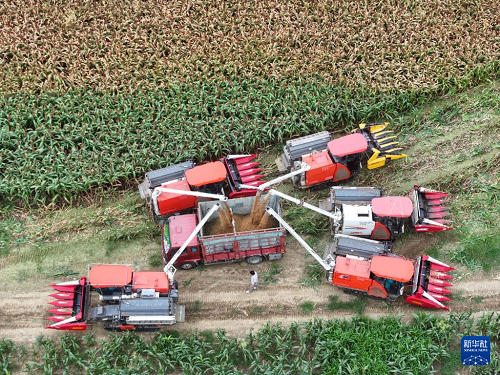 9月21日,收割機卸下收割的高粱(無人機照片)。(新華社記者 季春鵬 攝)