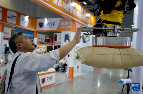 9月23日,參觀者在一個重物搬運輔助設(shè)備旁駐足觀看。(新華社發(fā) 楊勇 攝)