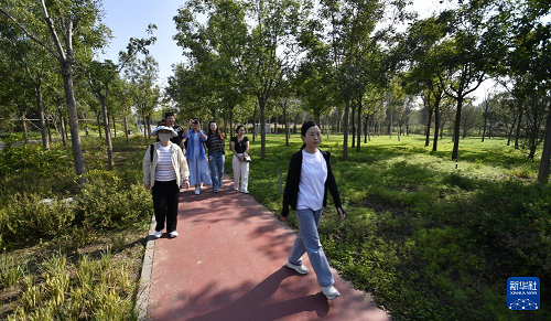 9月24日,市民在順義區(qū)后沙峪鎮(zhèn)的溫榆河公園內的步道上運動。(新華社記者 李欣 攝)
