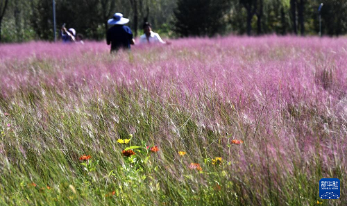 9月24日,市民在順義區(qū)后沙峪鎮(zhèn)的溫榆河公園內休閑賞花。(新華社記者 李欣 攝)