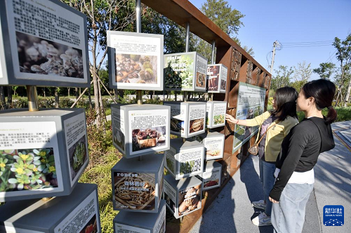 9月24日,市民在順義區(qū)后沙峪鎮(zhèn)的一處林間小型公園內觀看中藥材科普畫廊。(新華社記者 李欣 攝)