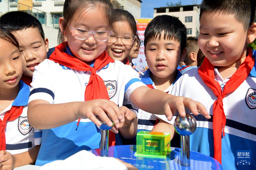 9月25日,四川省南充市南部縣紅巖子小學(xué)學(xué)生在體驗(yàn)趣味科普裝置。(新華社發(fā) 張櫪 攝)
