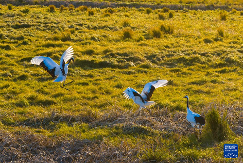 10月9日,在黑龍江撓力河國家級自然保護(hù)區(qū),丹頂鶴在濕地中活動(無人機(jī)照片)。(新華社發(fā) 韓陽 攝)