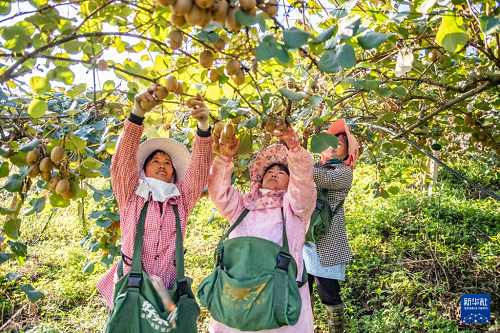 10月23日,農(nóng)民在云南省文山壯族苗族自治州西疇縣國家石漠公園獼猴桃種植基地采摘獼猴桃。(新華社發(fā) 熊平祥 攝)
