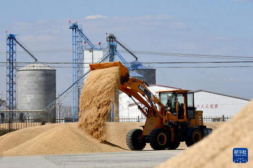 10月23日,鏟車在黑龍江北大荒農(nóng)業(yè)股份八五六分公司第六管理區(qū)一處曬場翻曬糧食。(新華社發(fā) 王金彬 攝)