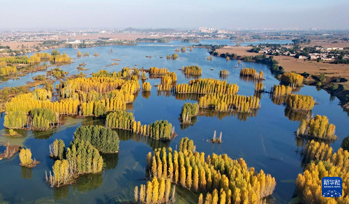 河北省邢臺市隆堯縣亦城村泜河風光(11月8日攝,無人機照片)。(新華社記者 牟宇 攝)