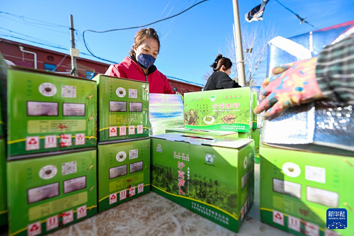 11月20日,在天津市西青區(qū)辛口鎮(zhèn),農(nóng)民在打包準(zhǔn)備發(fā)運的沙窩蘿卜。(新華社記者 趙子碩 攝)
