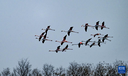 12月8日,火烈鳥在江蘇東臺(tái)條子泥濕地飛翔。(新華社發(fā) 孫家錄 攝)