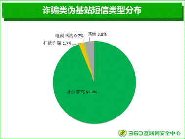那么,什么是偽基站?安全專家介紹,偽基站一般由主機(jī)和筆記本電腦組成,通過偽裝成運(yùn)營商的基站,冒用他人手機(jī)號碼強(qiáng)行向用戶手機(jī)發(fā)送詐騙、廣告推銷等短信息。這種新型犯罪覆蓋范圍廣,遍布全國各地,影響人群多,抓捕難度大,嚴(yán)重危害國家通訊安全和社會秩序。 根據(jù)360互聯(lián)網(wǎng)安全中心發(fā)布的統(tǒng)計,在所有由偽基站發(fā)送的垃圾短信中,廣告推銷類短信數(shù)量最多,占比高達(dá)42.5%;其次為違法信息類、詐騙信息類的短信,占比分別為33.8%和22.8%。 安全人員對詐騙類偽基站短信內(nèi)容進(jìn)行篩選和分析發(fā)現(xiàn),身份冒充類偽基站短信占到了絕大部分,占比為93.8%,打款詐騙(1.7%)、電商網(wǎng)站(0.7%)位列其后。