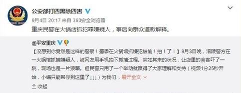 事后,有媒體了解到這名道歉者是來自重慶市涪陵區(qū)公安局荔枝派出所的一名民警。據(jù)他介紹,當時是正在對一名長期吸販毒的犯罪嫌疑人實施抓捕。由于嫌疑人吸食毒品精神亢奮且隨身攜有刀具,抓捕過程比較激烈,不少店內客人都起身圍觀,有些還拿出手機拍攝。抓捕結束后,帶隊民警第一時間找來餐館老板,亮明身份后表示警方會妥善處理餐館損失,并且特意向店內顧客道歉,于是就有了視頻中顯示的畫面。