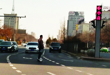 一男子騎助力車橫穿馬路,危險(xiǎn)?。ㄍ鯂?guó)棟 攝)