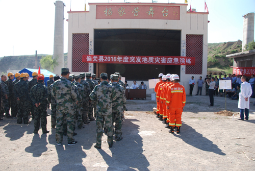為了進(jìn)一步做好地質(zhì)災(zāi)害防治工作,偏關(guān)縣于6月8日下午在陳家營(yíng)鄉(xiāng)楊家營(yíng)村舉行2016年突發(fā)地質(zhì)災(zāi)害應(yīng)急演練。該縣地質(zhì)災(zāi)害防治領(lǐng)導(dǎo)組各成員單位相關(guān)人員以及各鄉(xiāng)鎮(zhèn)鄉(xiāng)鎮(zhèn)長(zhǎng)、分管負(fù)責(zé)人約100余人參加了演練。通過此次演練,進(jìn)一步檢驗(yàn)了各部門職責(zé)的分工落實(shí),應(yīng)急隊(duì)伍的協(xié)調(diào)能力、技術(shù)裝備的合理配置、受災(zāi)群眾的防災(zāi)自我意識(shí)等各方面情況,為迅速、高效、有序做好地質(zhì)災(zāi)害防治工作奠定了良好的基礎(chǔ)。圖為演練現(xiàn)場(chǎng)。(劉源文 攝)