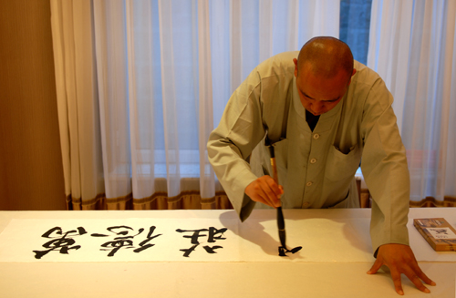 7月5日下午,筆者在五臺(tái)山金都山莊偶遇精彩一幕。只見(jiàn)數(shù)十人屏氣凝神,圍觀一行腳僧現(xiàn)場(chǎng)揮毫潑墨。行云流水之際,一幅幅書(shū)法作品躍然紙上。