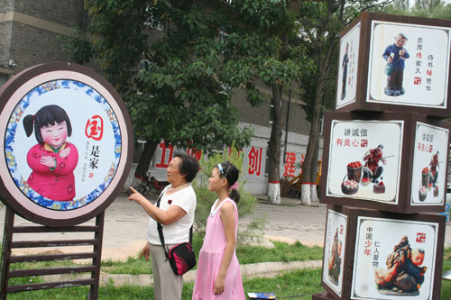 7月18日,原平市的家長正在忠孝園圖文并茂的宣傳圖畫前給孩子講解。該市通過多種形式的方法宣傳忠孝文化,讓市民們更加了解其傳統(tǒng)孝文化的內(nèi)涵和傳統(tǒng)美德,代代相傳,煥發(fā)起人們更加熱愛祖國和熱愛人民。(趙春曉 攝)