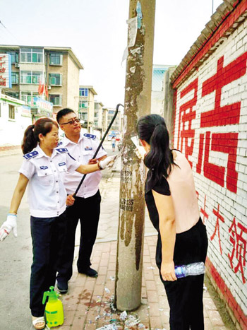 記者在利民西街看到,城管隊員手拿噴水器、小鏟子,對路邊電桿、墻壁、公交站牌等處的“小廣告”逐一認真清理。不少“小廣告”由于粘貼得比較牢靠,隊員們用手撕扯后再沖洗,但被粘貼的位置依然留下了斑斑痕跡,再一次經(jīng)過重復(fù)操作,“小廣告”才被徹底清除。圖為工作人員正在清理“小廣告”(張志遠 攝)