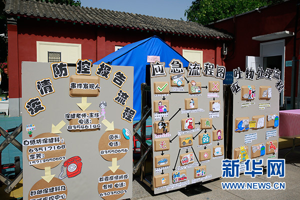 園內(nèi)放置了各種應(yīng)急流程指南。 新華網(wǎng)北京6月4日電 6月3日,為做好兒童返園準(zhǔn)備,北京市西城區(qū)三教寺幼兒園進(jìn)行了開園模擬演練。此次演練由幼兒園老師扮演家長和孩子,旨在讓老師知曉幼兒園防護(hù)措施且有的放矢地去開展活動(dòng),并通過線上的方式讓孩子們知道如何進(jìn)行自我保護(hù)。