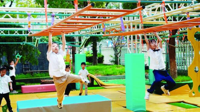 常州市五星幼兒園的負(fù)責(zé)人王艷表示,有一次同事將幾條外國(guó)幼兒園、小學(xué)低年級(jí)年齡段孩子進(jìn)行體能訓(xùn)練的視頻發(fā)了過來,視頻上的孩子能夠完成跳鞍馬、手倒立行走等動(dòng)作?!坝谑?,我們結(jié)合孩子們的意見,邀請(qǐng)專家共同繪制賽道構(gòu)思圖,將平衡、走、跑、跳、攀爬、懸掛等動(dòng)作元素融為一體,打造出一個(gè)綜合性的體能游戲賽道?!?/p>