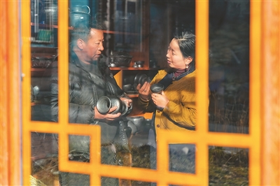 在德格縣麥宿鎮(zhèn)的扎堪倉(cāng)黑陶工坊,達(dá)瓦卓瑪(右)向工坊主理人降擁格乃了解工坊近期的經(jīng)營(yíng)情況以及新品研制進(jìn)展。新華社記者 沈伯韓攝