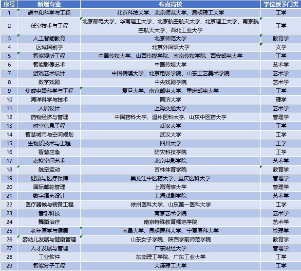 此外,從學位授予門類來說,工學專業(yè)較多,包括智能視聽工程、智能分子工程、智慧應急、智慧應急、時空信息工程、生物質(zhì)技術與工程等;教育學專業(yè)包括人工智能教育、航空運動等。這其中,布點高校最多的專業(yè)為智能視聽工程,有4所高校設立。