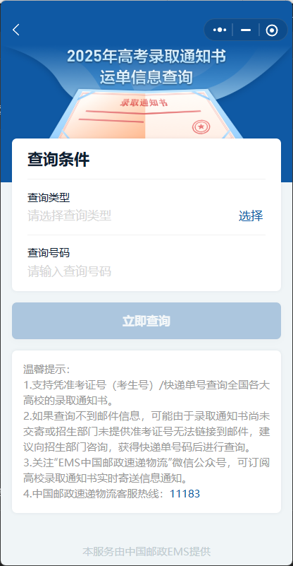 考生可以通過國務(wù)院客戶端小程序,進行高考錄取通知書運單信息查詢。?