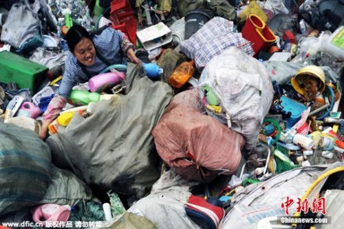 資料圖。2015年4月6日,重慶,這是清理工在堆碼場將大包的垃圾轉運至分揀點,以方便開包處理。 江上鷗 攝 圖片來源:東方IC