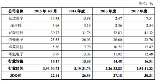 招股書顯示,易德龍負債水平偏高,流動負債占比超過95%,面臨較大的短期償債風(fēng)險。而除了償債風(fēng)險外,公司主營業(yè)務(wù)毛利率在報告期內(nèi)持續(xù)下降,2012年為30.31%,到2015年9月末已降至22.44%,而同時期內(nèi)行業(yè)銷售毛利率均值基本穩(wěn)定在27%左右。