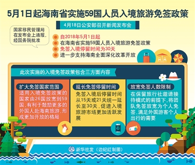 “擴(kuò)大免簽國范圍;延長免簽停留時(shí)間;放寬免簽人數(shù)限制?!?月18日,公安部在京召開新聞發(fā)布會(huì),國家移民管理局在發(fā)布會(huì)上通報(bào):經(jīng)國務(wù)院批準(zhǔn),自2018年5月1日起,在海南省實(shí)施59國人員入境旅游免簽政策,進(jìn)一步支持海南全面深化改革開放。