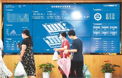 浙江省杭州市的5G農(nóng)貿(mào)市場——駱家莊農(nóng)貿(mào)市場的大屏幕上實(shí)時(shí)顯示交易、客流等相關(guān)情況。新華社記者 韓傳號(hào)攝