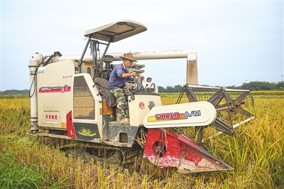 我國(guó)糧食產(chǎn)量連續(xù)6年保持在1.3萬(wàn)億斤以上,與農(nóng)業(yè)現(xiàn)代化和土地充分利用密不可分。圖為今年秋季一名農(nóng)民駕駛收割機(jī)在海南??邶埲A區(qū)龍泉鎮(zhèn)新江村收割晚稻。新華社記者 蒲曉旭攝