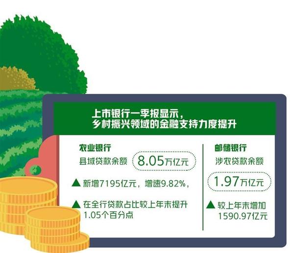 近日,各家上市銀行一季報先后披露完畢。從公開數(shù)據(jù)看,中國農(nóng)業(yè)銀行、中國郵政儲蓄銀行等在鄉(xiāng)村振興領(lǐng)域的金融支持力度持續(xù)提升。其中,農(nóng)業(yè)銀行縣域貸款余額達(dá)8.05萬億元,新增7195億元,增速9.82%,增量創(chuàng)歷史同期新高,在全行貸款占比較上年末提升1.05個百分點(diǎn)。郵儲銀行涉農(nóng)貸款余額1.97萬億元,較上年末增加1590.97億元;建成信用村38.69萬個,評定信用戶超千萬戶,主動授信白名單客戶貸款本年凈增366.20億元。