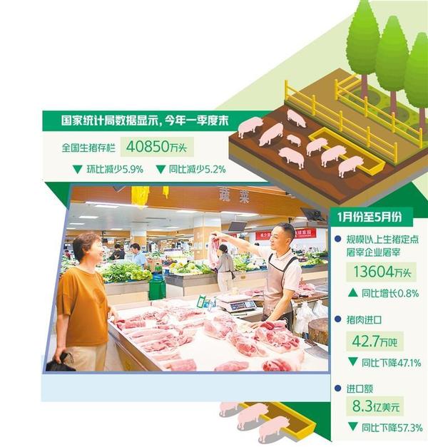 國家統(tǒng)計局?jǐn)?shù)據(jù)顯示,今年一季度末,全國生豬存欄40850萬頭,環(huán)比減少5.9%,同比減少5.2%。一季度,全國生豬出欄19455萬頭,同比下降2.2%;豬肉產(chǎn)量1583萬噸,同比下降0.4%。5月末能繁母豬存欄3996萬頭,環(huán)比增長0.2%,同比下降6.2%。1月份至5月份規(guī)模以上生豬定點屠宰企業(yè)屠宰13604萬頭,同比增長0.8%。2月份開始屠宰量低于上年同期,5月份規(guī)模以上生豬定點屠宰企業(yè)屠宰2666萬頭,同比下降5.0%。