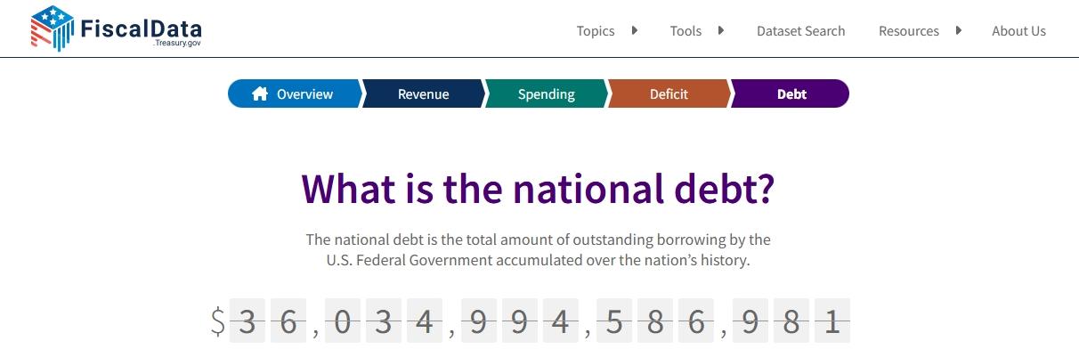 △美國財政部下屬的財務(wù)數(shù)據(jù)網(wǎng)站當前數(shù)據(jù)顯示,美國聯(lián)邦政府債務(wù)總額已達到36.034萬億美元。