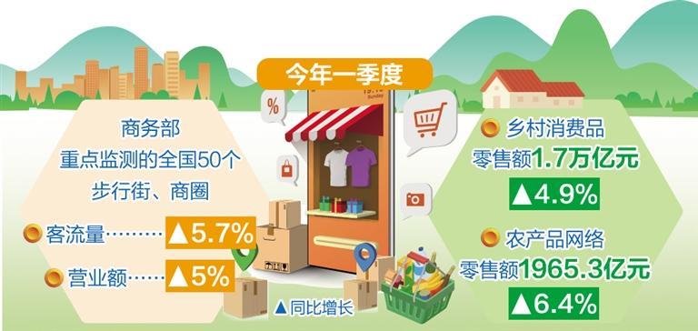 城市商業(yè)增速穩(wěn)定,一季度商務(wù)部重點(diǎn)監(jiān)測的全國50個(gè)步行街、商圈客流量、營業(yè)額同比分別增長5.7%、5%??h域消費(fèi)市場持續(xù)升溫,鄉(xiāng)村消費(fèi)品零售額1.7萬億元,同比增長4.9%,增速高于城鎮(zhèn)0.4個(gè)百分點(diǎn)。農(nóng)村電商蓬勃發(fā)展,全國農(nóng)村網(wǎng)絡(luò)零售額6697.5億元,同比增長5.1%;農(nóng)產(chǎn)品網(wǎng)絡(luò)零售額1965.3億元,同比增長6.4%。