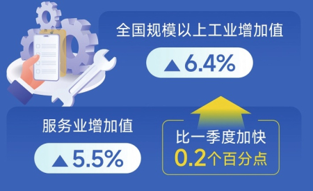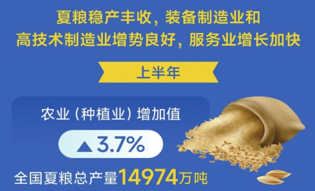 夏糧穩(wěn)產(chǎn)豐收,裝備制造業(yè)和高技術(shù)制造業(yè)增勢良好,服務(wù)業(yè)增長加快。上半年,農(nóng)業(yè)(種植業(yè))增加值同比增長3.7%,全國夏糧總產(chǎn)量14974萬噸;全國規(guī)模以上工業(yè)增加值同比增長6.4%,其中裝備制造業(yè)增加值同比增長10.2%,高技術(shù)制造業(yè)增加值增長9.5%,增速分別快于全部規(guī)模以上工業(yè)3.8和3.1個百分點;服務(wù)業(yè)增加值同比增長5.5%,比一季度加快0.2個百分點。